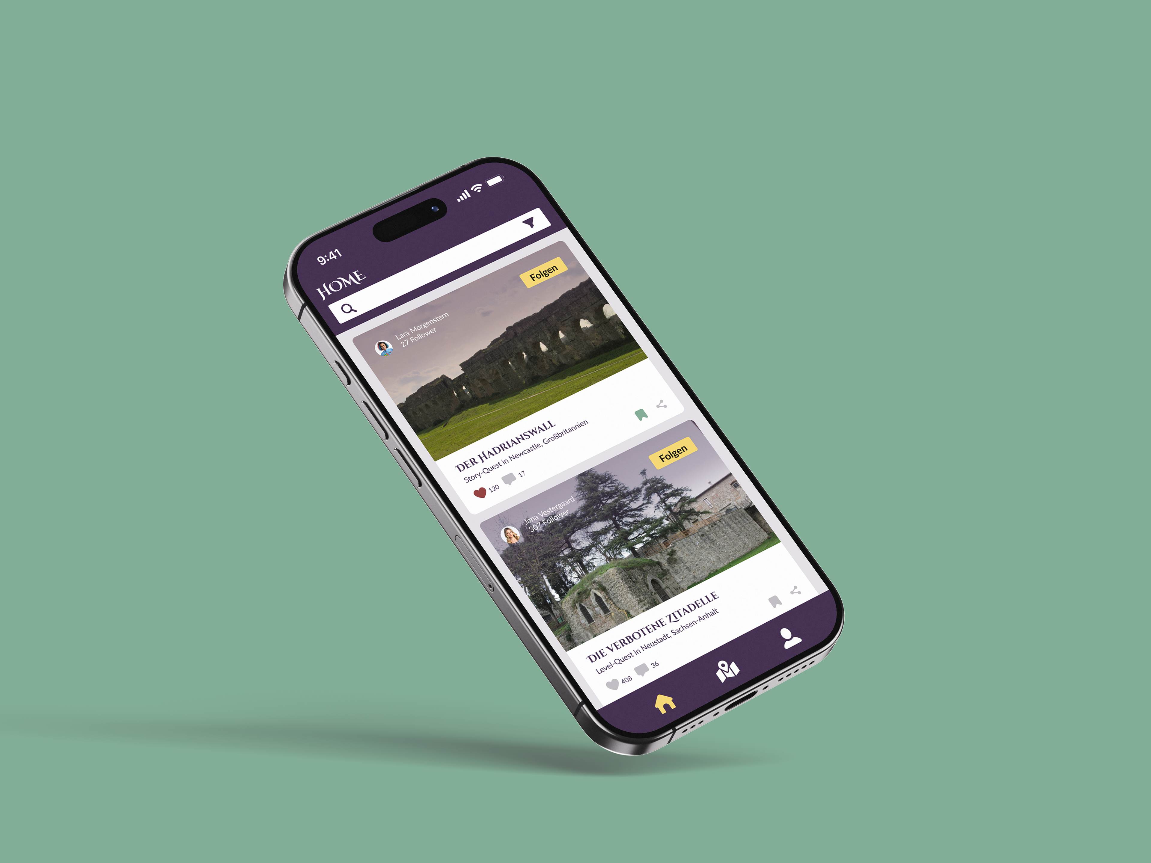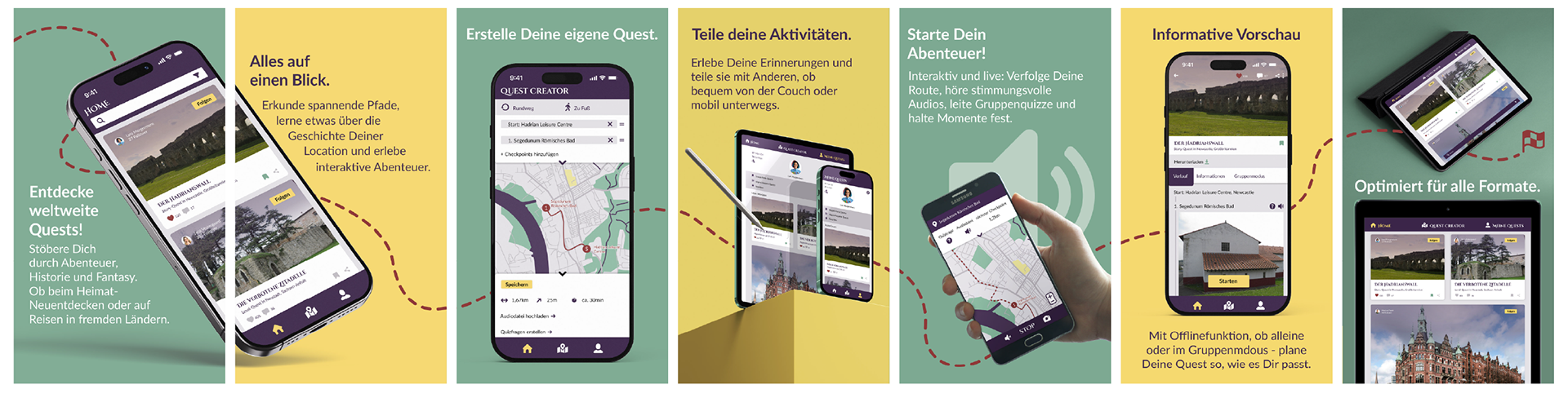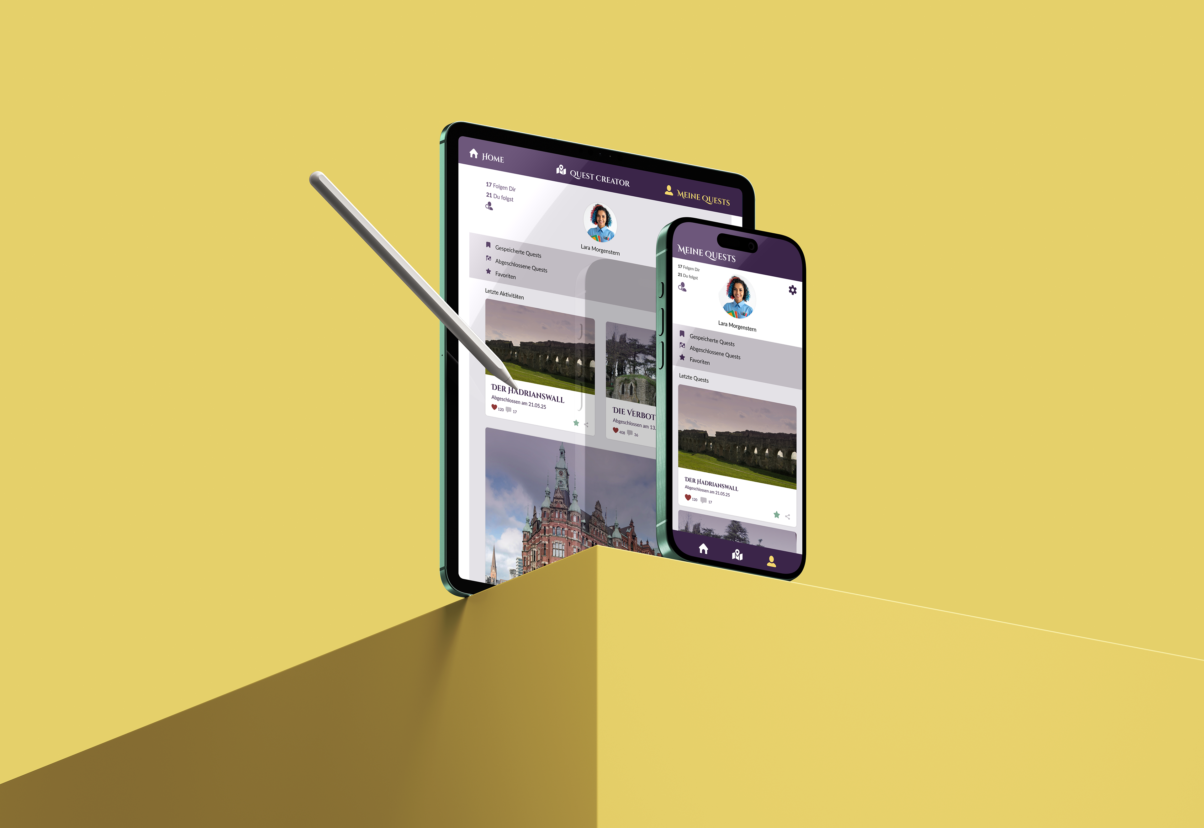 Die responsive Gestaltung erlaubt das bequeme Nutzen der App auf verschiedenen Handy-Formaten mobil sowie dem iPad daheim. Ein Unterschied zwischen der Darstellung am Smarpthone versus dem iPad ist die Positionierung des Hauptmenüs mit den drei zentralen Navigationspunkten. Da Smartphones meist einhändig im Hochformat gehalten werden befindet sich das Menü hier im Footer, gut mit dem Daumen erreichbar. Am iPad befindet es sich im Header, da dieses oft beidhändig oder auf einem Tisch stehen verwendet wird. Außerdem werden die Quest-Kacheln auf dem iPad als abwechselnd zweispaltiges und einspaltiges Grid angeordnet, da hier mehr Platz zur Verfügung steht, während sie am Smartphone stets einseitig dargestellt werden. Die Gestaltung der einzelnen Elemente und Komponenten bleibt jedoch über alle Formate konsistent für ein kohärentes Nutzererlebnis.