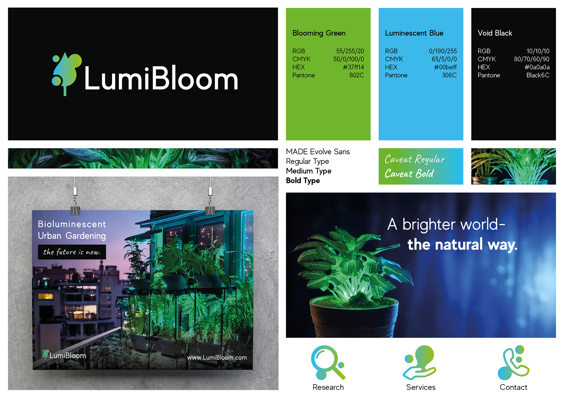 In meiner Markenstrategie-Präsentation bietet das Unternehmen seinen Kunden die Möglichkeit, biolumineszente Stadtgärten zu gestalten und damit unsere Städte durch leuchtende Pflanzen zum Strahlen zu bringen. Um mit dem mystischen, aber auch wissenschaftlich-technischen Charakter des Produkts zu spielen, arbeitet das Design mit sehr dunklen oder schwarzen Hintergründen, wodurch weiße Schrift und die grün-blauen Unternehmensfarben besonders leuchtend wirken.