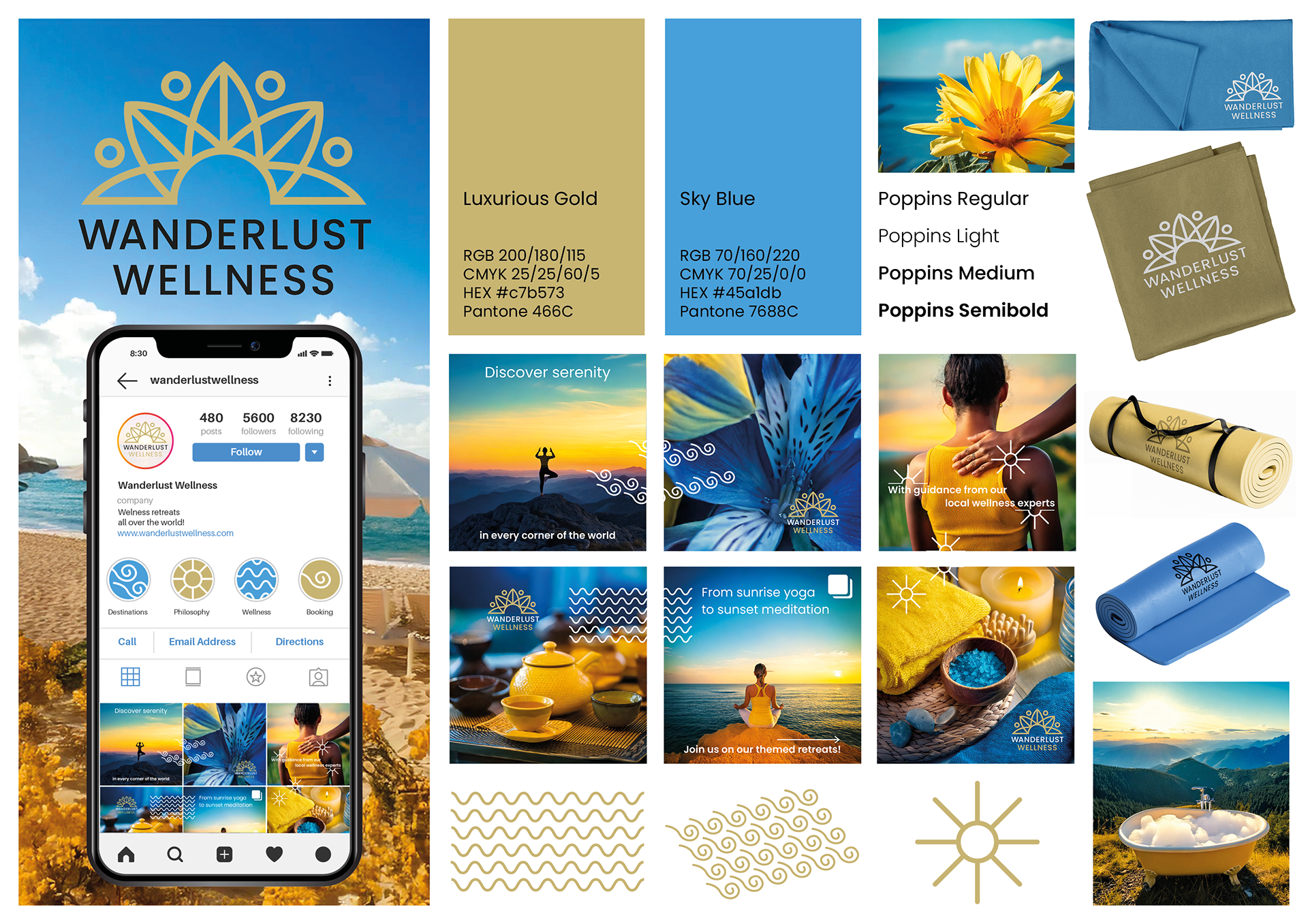 Die Bildsprache vermittelt einen inspirierenden Einblick in die Atmosphäre dieser Retreats und greift zugleich das definierte Farbkonzept auf. Sekundäre grafische Elemente können in Print- und Digitalmedien verwendet werden, um die Themen von Wanderlust Wellness zu unterstreichen und die Markenidentität zu festigen – wie im Beispiel des Instagram-Accounts zu sehen ist. Die Präsentation zeigt außerdem, wie das Logo auf Merchandise aussehen könnte, den Kunden während ihrer Reise erhalten.