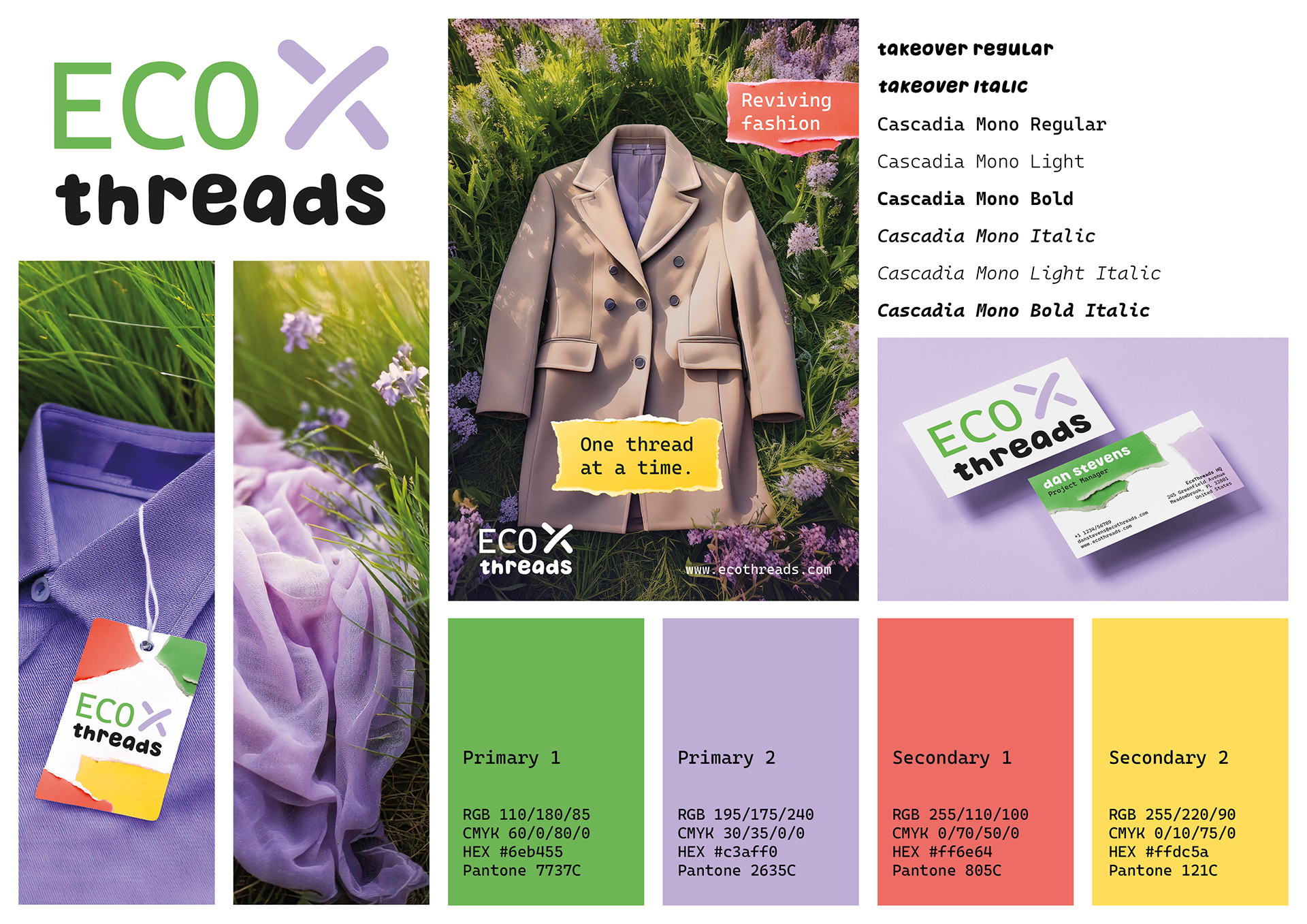 EcoThreads ist ein Modeunternehmen, das sich auf recycelte Kleidung spezialisiert hat – neue Kleidungsstücke entstehen aus Secondhand-Materialien. Die Marke vermittelt eine fröhliche, verspielte und dennoch professionelle und vertrauenswürdige Ausstrahlung.