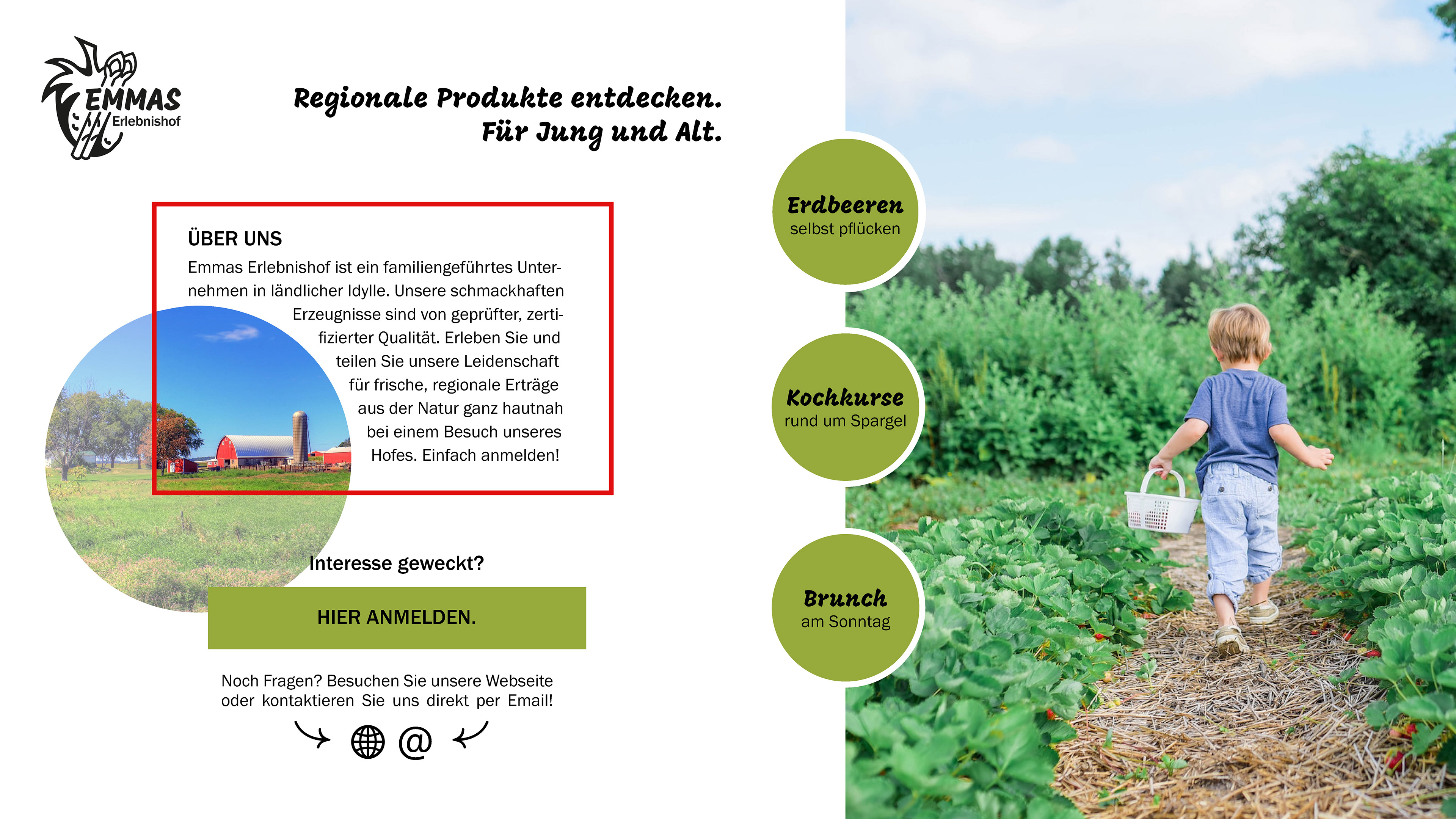 Als erstes Uniprojekt in Adobe InDesign erstellte ich diesen digitalen Flyer für einen fiktiven Erdbeer- und Spargelhof. Das PDF enthält ein interaktives Anmeldeformular sowie Buttons, über welche weitere Informationen zu den drei Serviceangeboten geöffnet werden können.