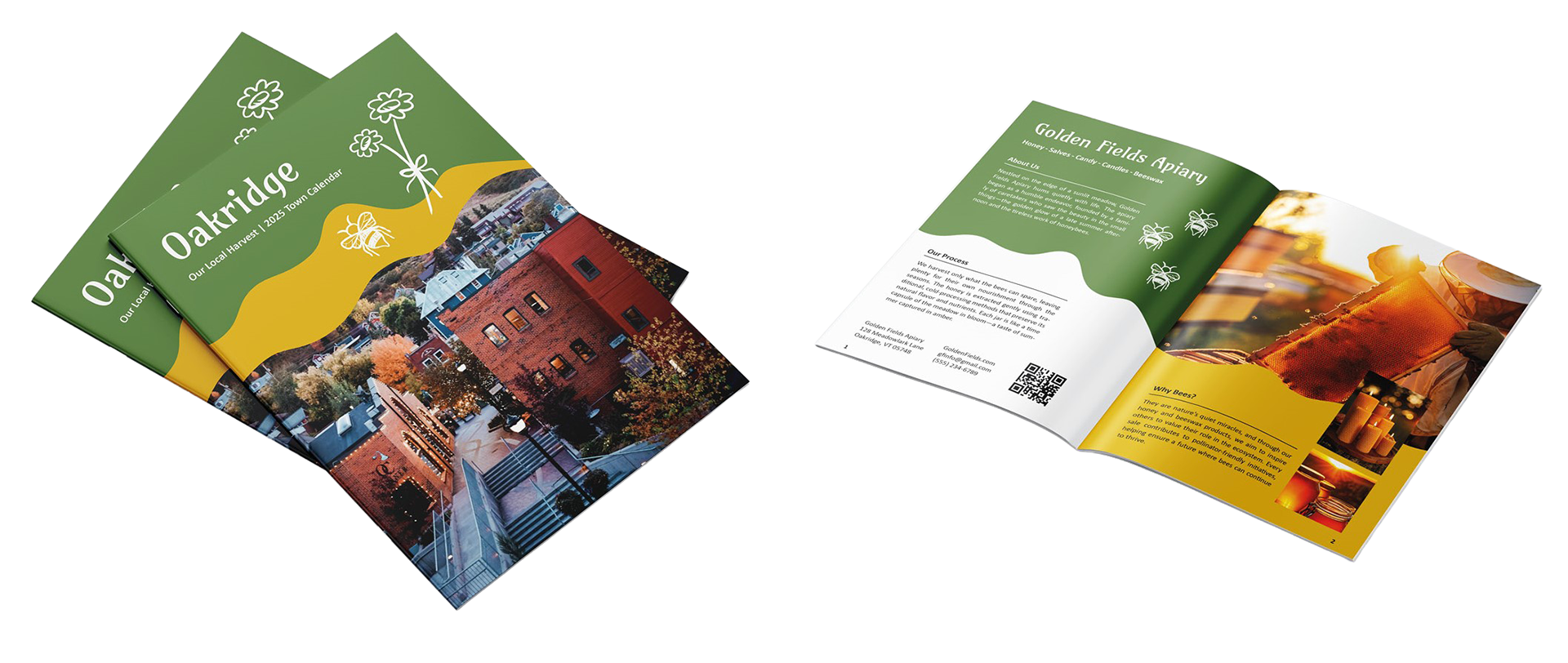 Diese DIN-A5-Broschüre feiert die lebendige Gemeinschaft lokaler Unternehmen und Kunsthandwerker in dem fiktiven Ort Oakridge und dient als kuratierter Guide zu den kreativen Angeboten, Traditionen und handwerklichen Schätzen der Stadt. Sie hebt die Kreativität und Leidenschaft der lokalen Gemeinschaft hervor.