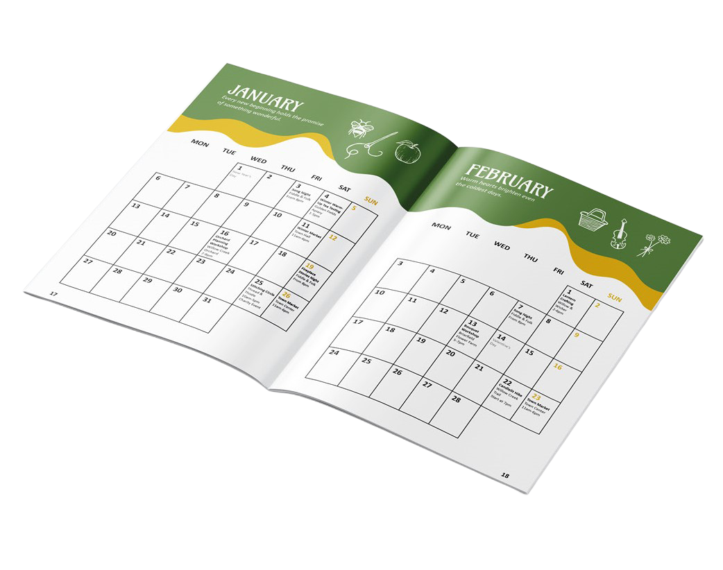 Neben Porträts der Kunsthandwerker enthält das Heft einen umfassenden Jahreskalender, der Veranstaltungen, Workshops und Feste von Unternehmen und Stadt aufführt. Ergänzt durch Notizfelder lädt es die Leser ein, eigene Termine und Aktivitäten einzutragen.