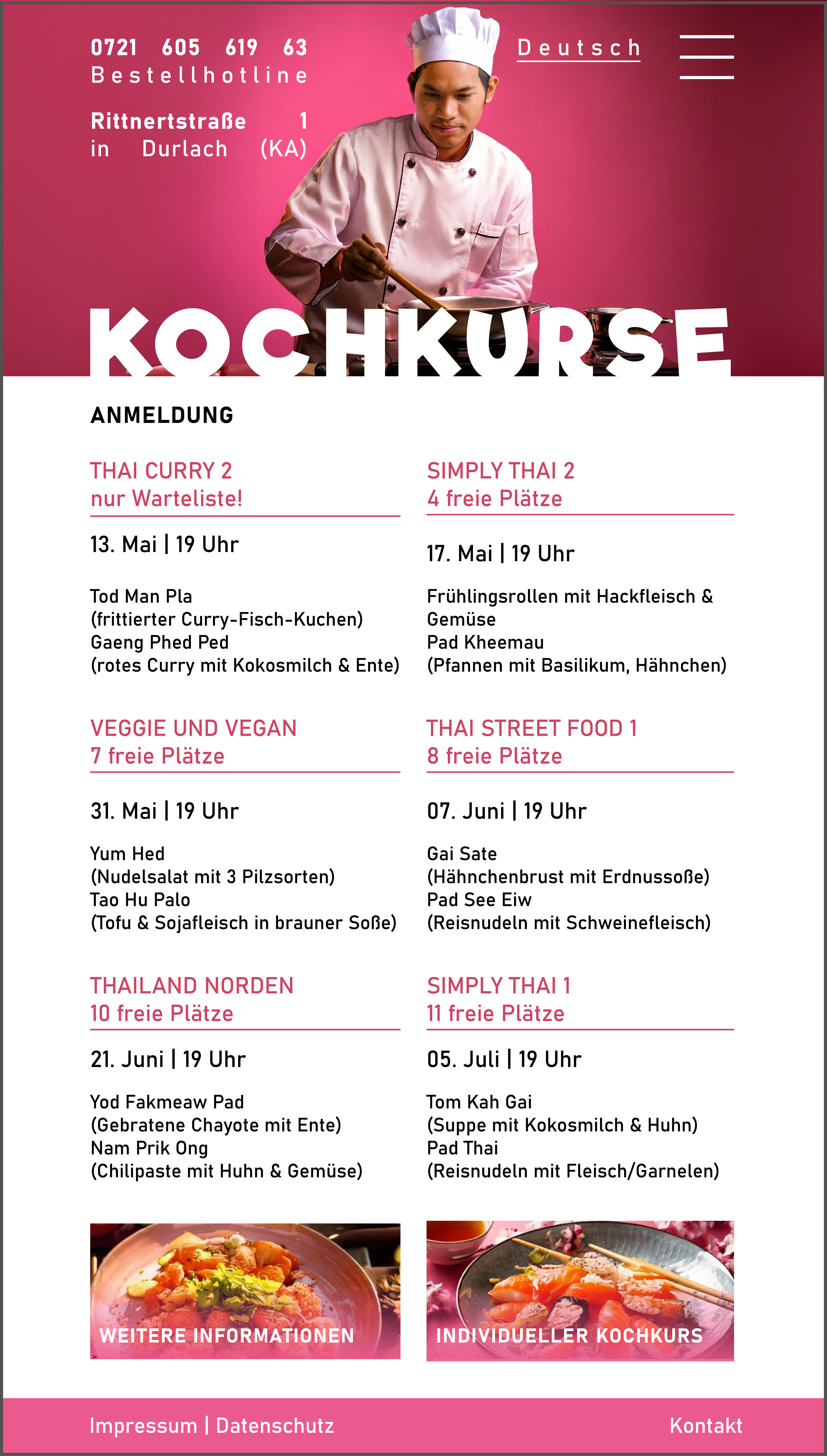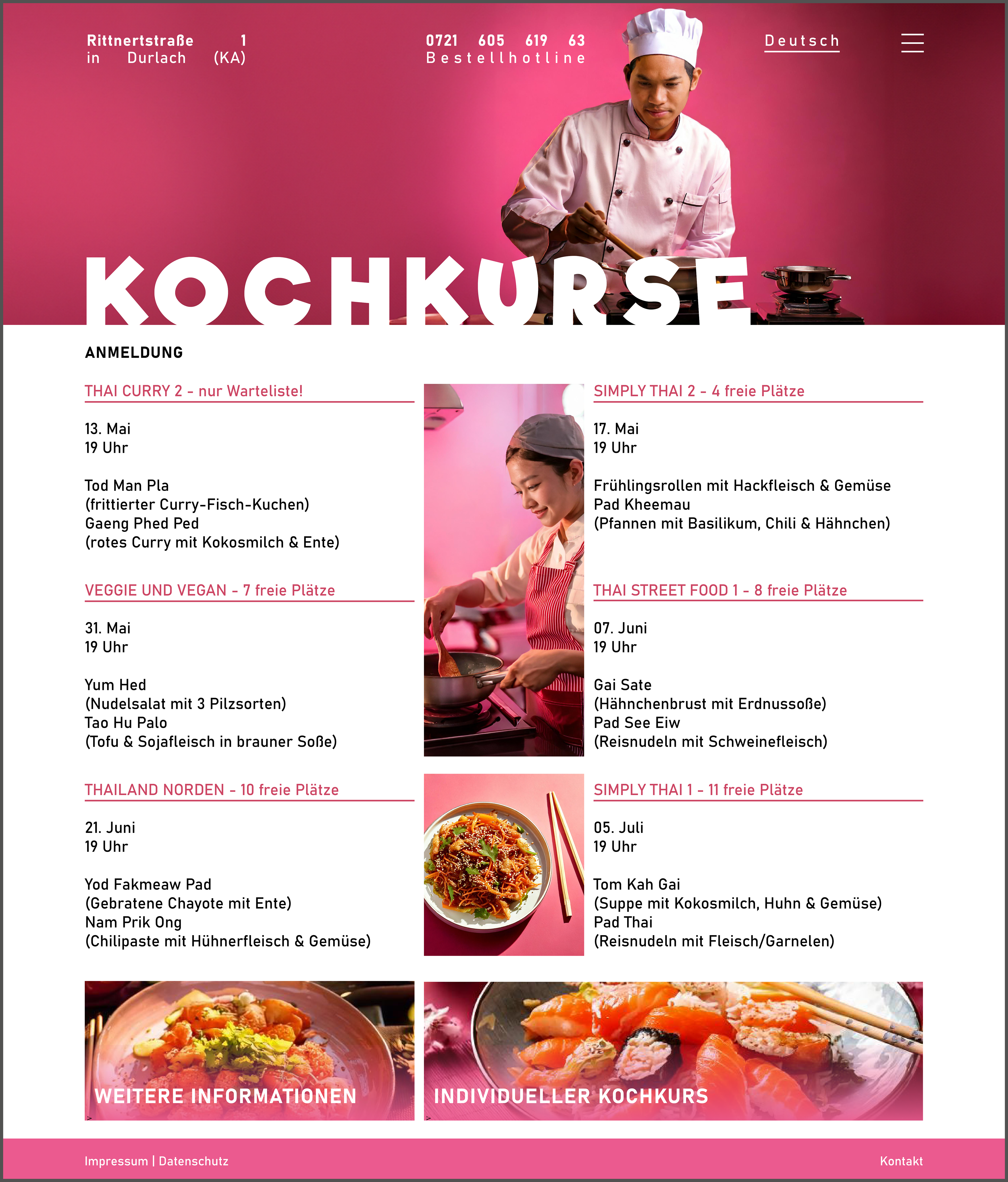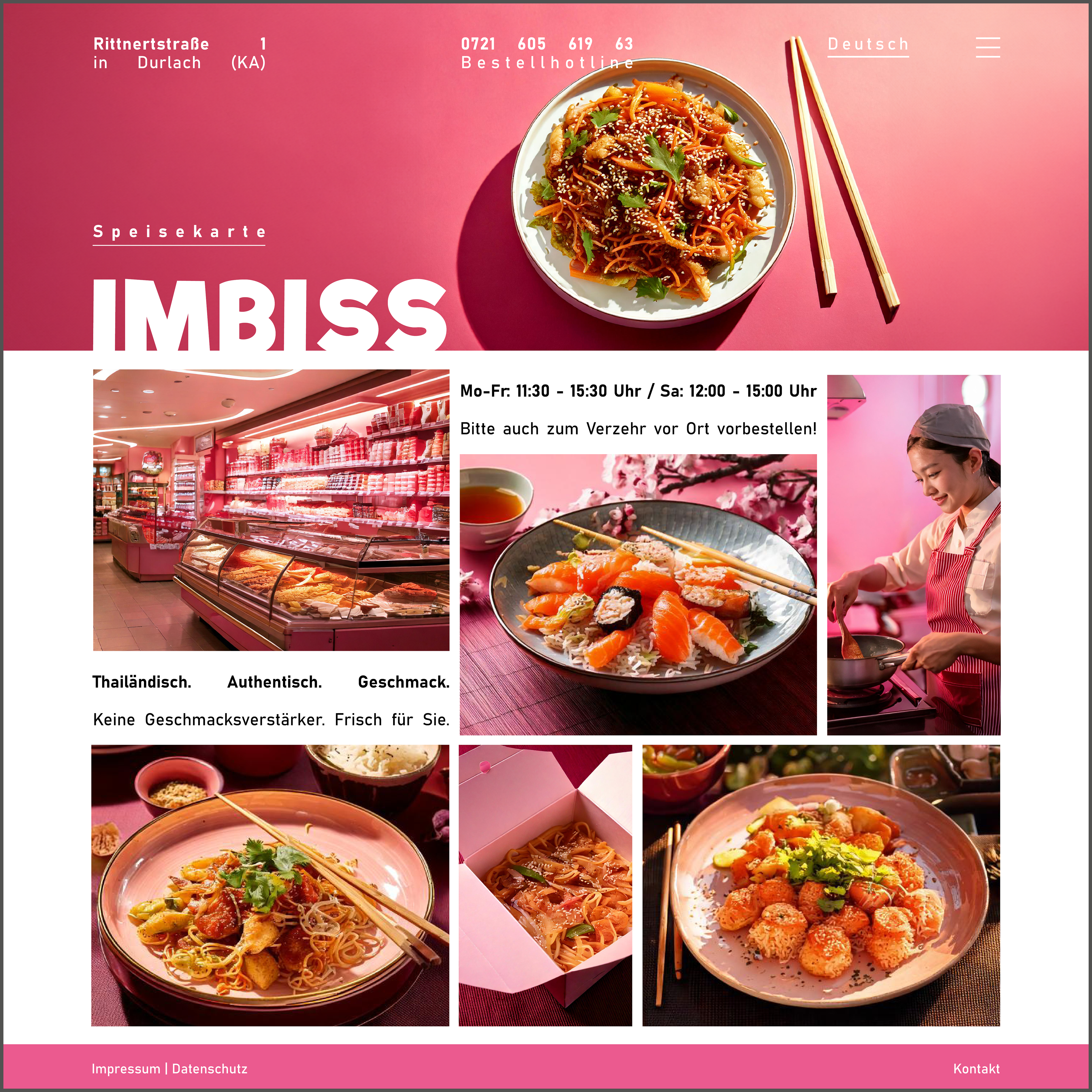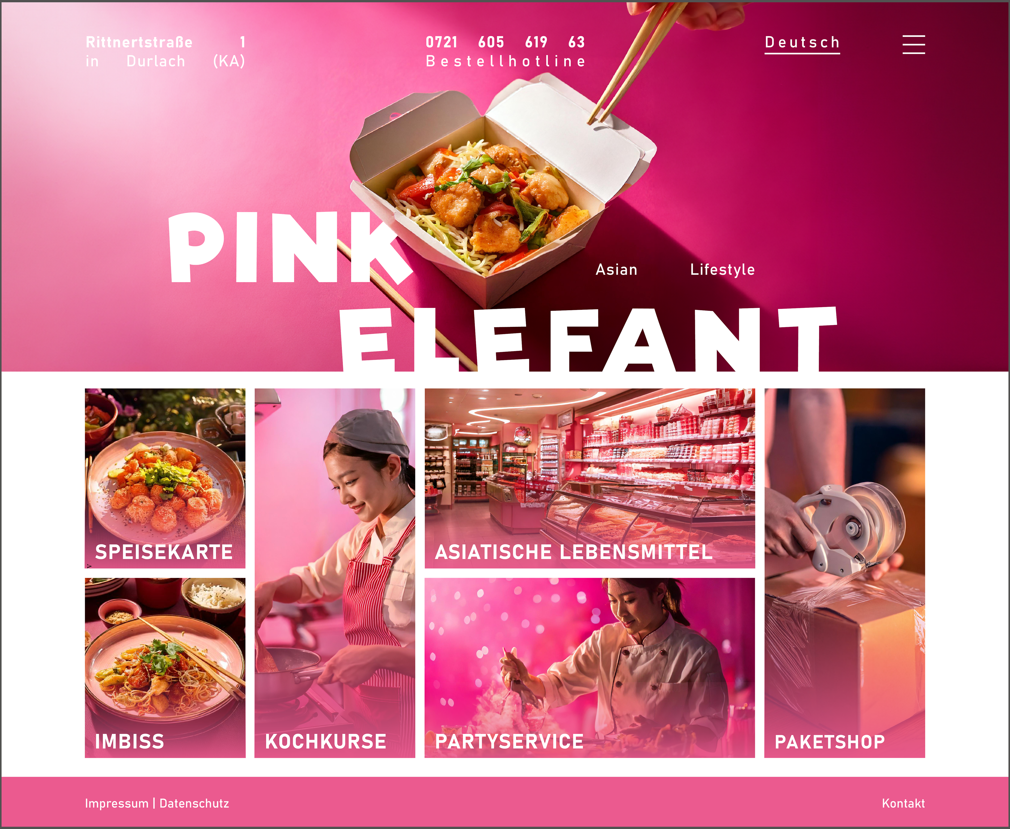 Die Website kombiniert prägnante, ausdrucksstarke Grafiken mit minimalem Texteinsatz, um eine emotionale Wirkung zu erzeugen und die Nutzer in die Welt der thailändischen Küche und Kultur von Pink Elefant eintauchen zu lassen.
